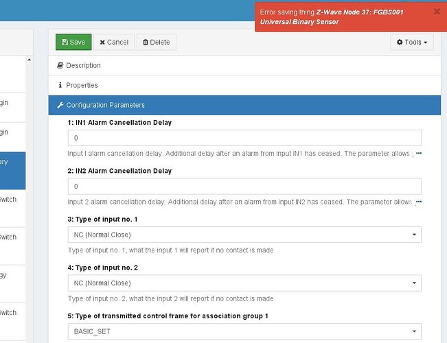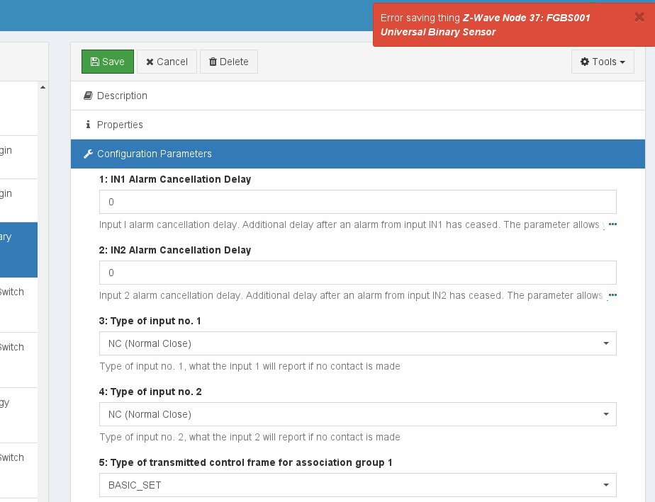 I’m trying to get habmin configuration to work, I don’t know if you remember, but I have had issues with it earlier. Anyway, I can change a name of a thing, as well as polling period. But if I e.g. want to change a node setting, e.g. association group or a configuration parameter, after I press the green save, I get: