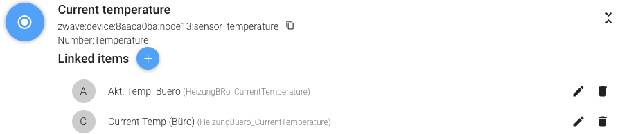 I create, to a channel of a zWave- Thing, an item (HeizungBuero_CurrentTemperature) via Paper UI and add it to a group. In the Basic UI I show all values of this group: