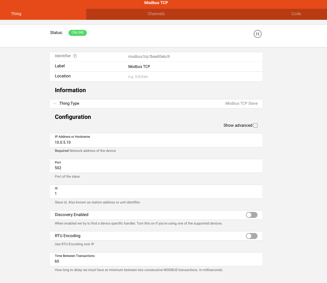 Step 3. Setup TCP Slave with Heat pump network settings. I don’t see any reference to an “ID” in my heatpump settings, don’t know what this is supposed to be. Thing shows as ONLINE even if I use wrong details.