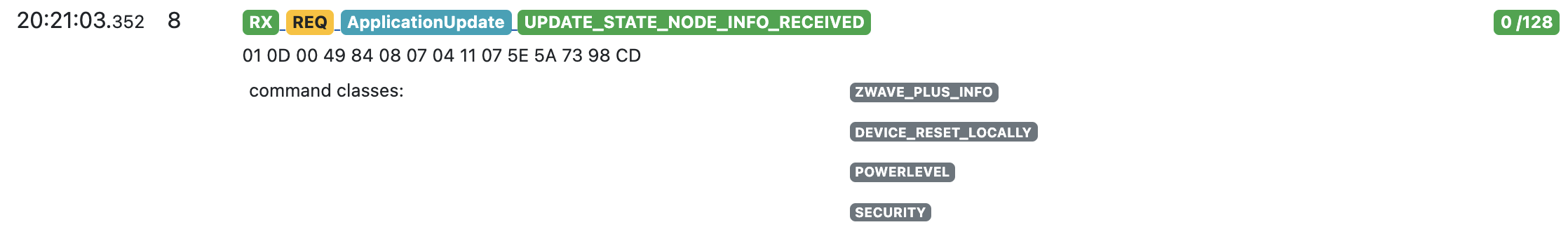 This is where the device reports what command classes it supports, and, well, it’s a short list. The binding relies on this list to decide what to do and how to configure the device and it’s why the initialisation stages drop through with nothing being sent -: