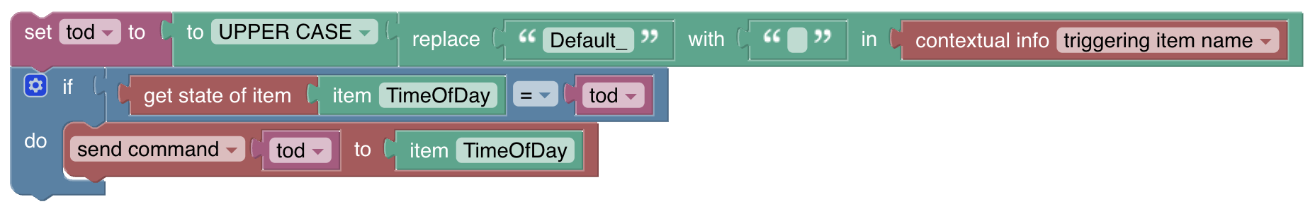 The first error is you chose the wrong Item for the Time of Day State Item. You need to choose your TimeOfDay Item, not Default_Day. The TimeOfDay Item is properly defined as a String.