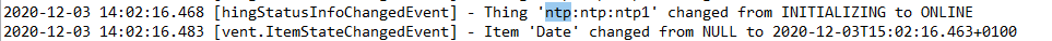 Installed the NTP binding which is ONLINE and defined a Item “Date” in the items file.