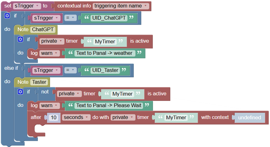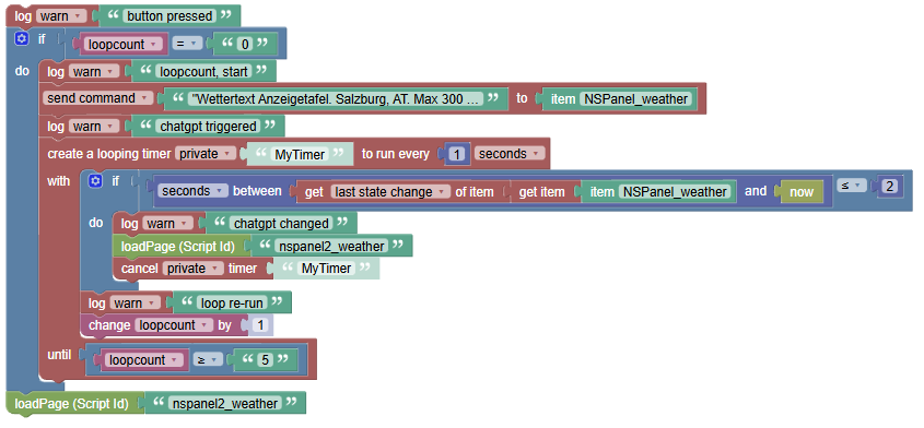 I’m triggering an chatGPT channel that updates item NSPanel_weather. as this is a cloud based service it takes between 0,5 and 4 secs to update the item. the “while” loop should run until the item is changed. if for some reason something fails, the loop should not run longer than 10sec.