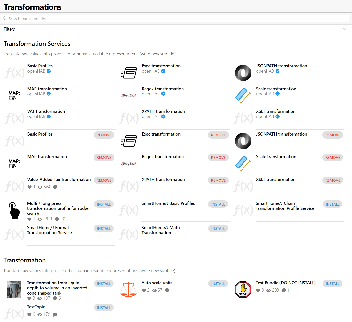 I assert that there’s a need for some clarification on the terms surrounding transformations. This started as we were discussing some modifications to how the community marketplace is shown, but despite our best efforts myself and @rlkoshak have been unable to reach a consensus. I get that many things OH is a bit “ad hoc”, and that things end up the way the author that volunteers to do it, does it. That’s fine in many situations, but when it comes to “fundamental concepts” for how OH does what it does, I think some coordination and consensus is beneficial.