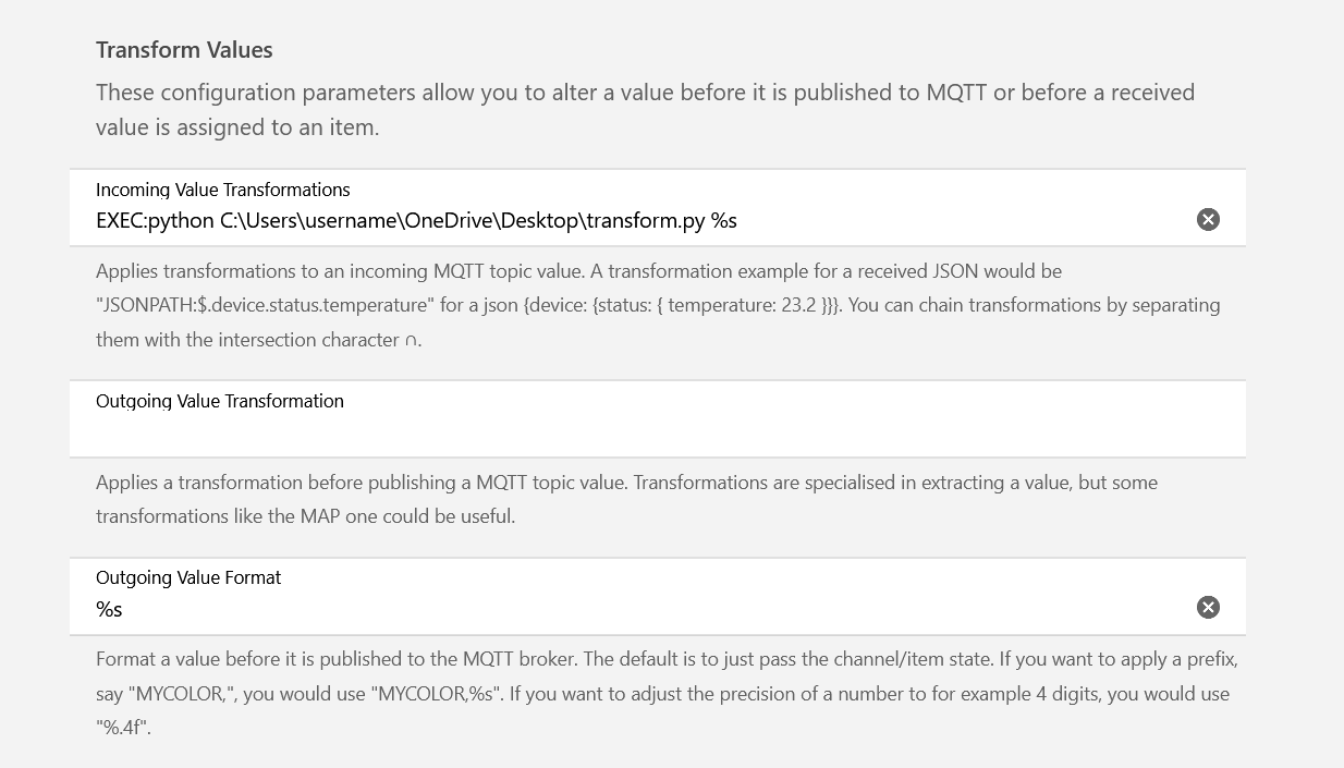 Tbh it’d be much better if the exec mqtt incoming msg transformation worked but it just wont execute commands