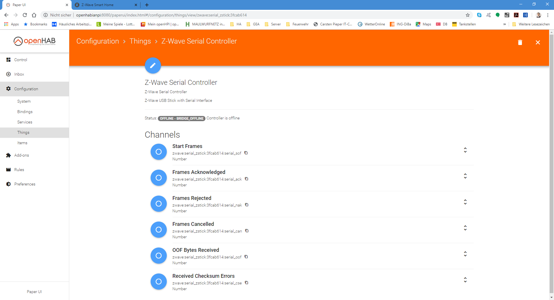 thanks, I know added a Z-Wave Serial Controller via the Z-Wave binding. After that, the state of the controller is “offline - Bridge_offline”. It does not matter if I choose /dev/ttyACM0 or /dev/ttyAMA0.