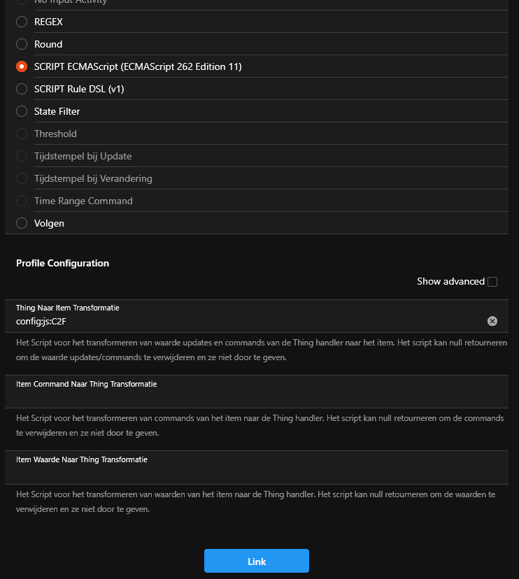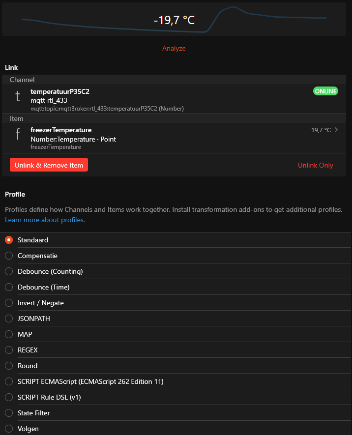 Links. Here we decide what information we want to use. An Astro Sun Data thing can provide us with about 75 channels. We don’t want to use all this information. A link defines a connection between an available channel and an item. Inside the link we can use profile transformations to convert the information that we send to the item. The Astro sun data has a channel for the sun elevation with 16 decimals. At the link level I could round the value to 1 decimal. on the other hand I don’t want to do this with the electricity power as I will use this later to make some calculations and therefore need all the decimals.