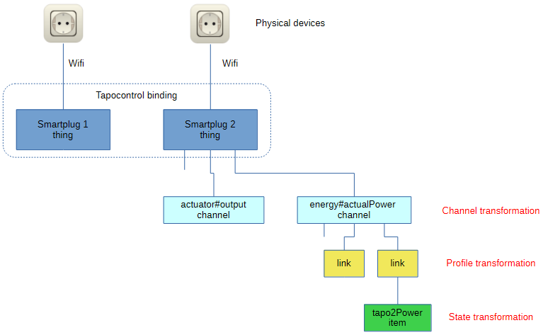 Channels represent the measurements or other data that is made available in the thing. The Tapo P115 can give you the actual measured power or the status of the output switch. Channel transformations (also known as binding transformations) can be used to convert the data that will be used by all the items linked to that channel.