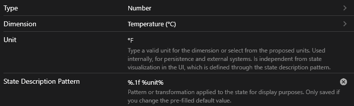 Here you see an example of a temperature sensor with no profile transformation and a state description pattern %.1f %unit%: