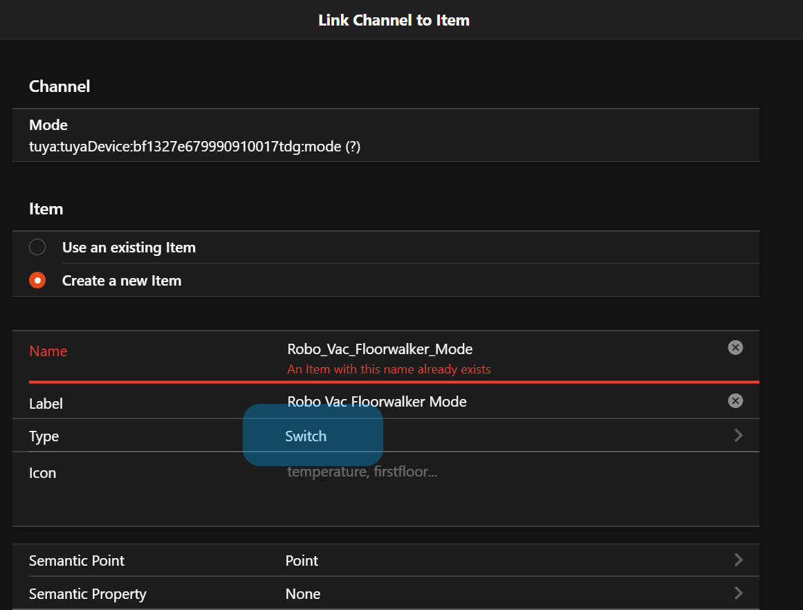 2026-01-06 23:20:20.324 [WARN ] [a.internal.handler.TuyaDeviceHandler] - Could not update channel 'break_clean' of thing 'tuya:tuyaDevice:bf1327e679990910017tdg' with value 'false'. Datatype incompatible.