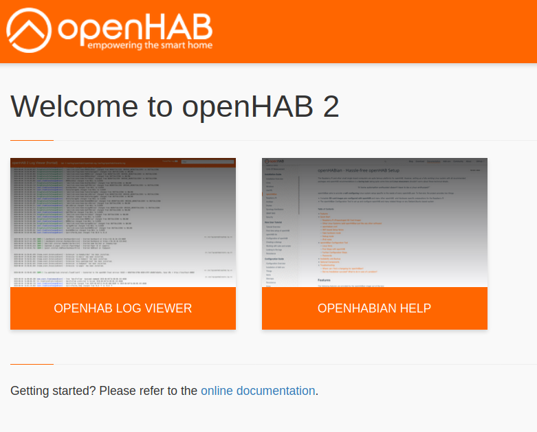 when the tutorial mentions that I could follow progress of the installation by visiting openhabiandevice but I was only able to visit it by going to the above ip addresses. It offered me to choose an UI I picked standard, as recommended. The UI then simply offeres me two options the log or the help docs.