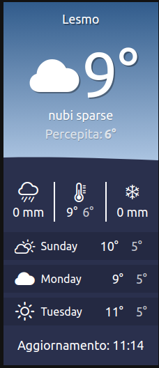 It shows the current temperature , apparent temperature, condition (+icon), humidity and wind-speed as well as a forecast for the next x-days for which it also shows the min-/max-temperature, humidity, wind-speed and precipitation probability in a accordion-module.