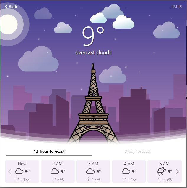 This is a weather card which shows the current- and apparent temperature, condition (+icon) as well as a slideable hourly-, daily- and %-precipitation-forecast.