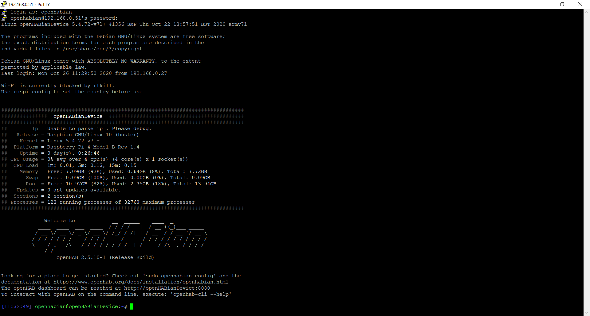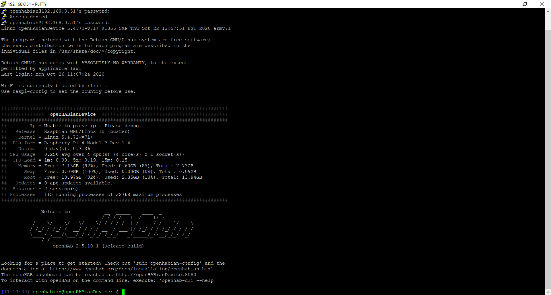 When I try to SSH into openhabian its no longer working when I set the hostname to openhabian but it allows me to SSH into openhabian through my IP address however even though it says I’m connected I can’t access openhab from the internet. I can login in on my Raspberry Pi but can’t access openhab on the internet either from openhab:8080 or when searching by my IP address. On my Raspberry Pi it says “IP = unable to parse ip. Please debug”. When I try to SSH into openhabian it says “IP = unable to parse ip. Please debug”.