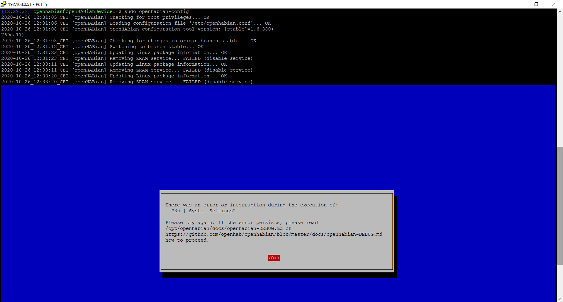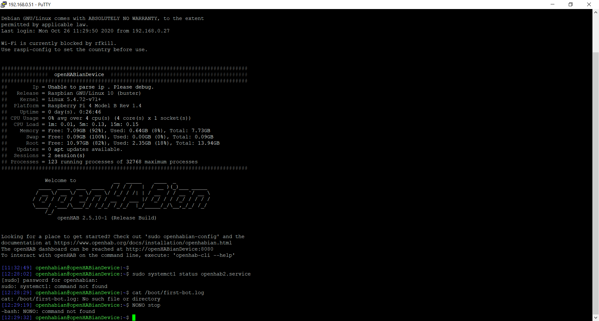 I setup a brand new PI 4/8 with 128GB SD and the recommended “openHABian-OS”.