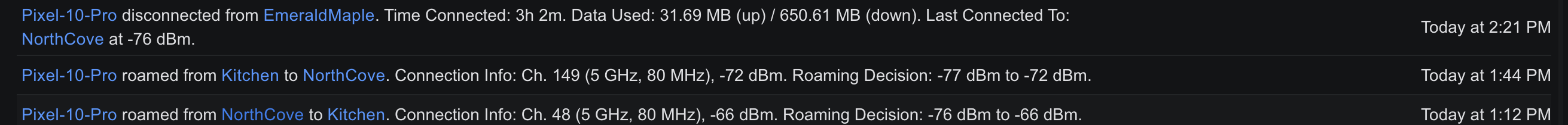 The unifi log for the same period doesn’t show a corresponding event (unfortunately it is displayed via a bunch of table cells and doesn’t format well when cut/pasted, so I’m using an image)