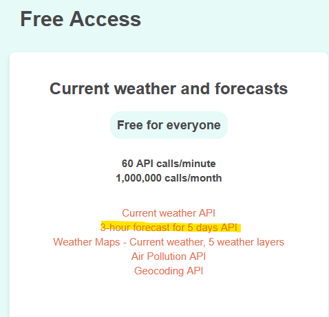 You can search weather forecast for 5 days with data every 3 hours by geographic coordinates. All weather data can be obtained in JSON and XML formats.