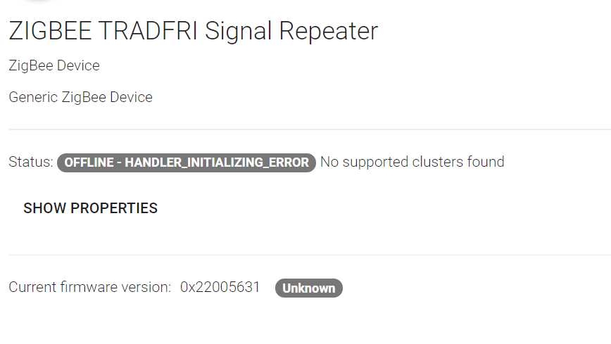 2020-07-12 10:49:41.997 [DEBUG] [scovery.ZigBeeNodePropertyDiscoverer] - 680AE2FFFE98C079: ZigBee node property discovery complete: {zigbee_logicaltype=ROUTER, zigbee_powerlevel=FULL, zigbee_manufacturercode=0x117c, modelId=TRADFRI Signal Repeater, zigbee_networkaddress=33903, zigbee_powersource=MAINS, zigbee_stkversion=98, zigbee_datecode=20190311, zigbee_zclversion=3, vendor=IKEA of Sweden, zigbee_powermode=RECEIVER_ON_IDLE, zigbee_powersources=[MAINS], hardwareVersion=1, firmwareVersion=0x22005631, zigbee_applicationVersion=33}