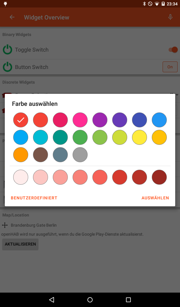 It sends the new color as soon as the user clicks on it and not just after closing the dialog. I’ll add an indicator which color is currently selected, but I don’t know how to add a picker for custom colors. Would you miss such?