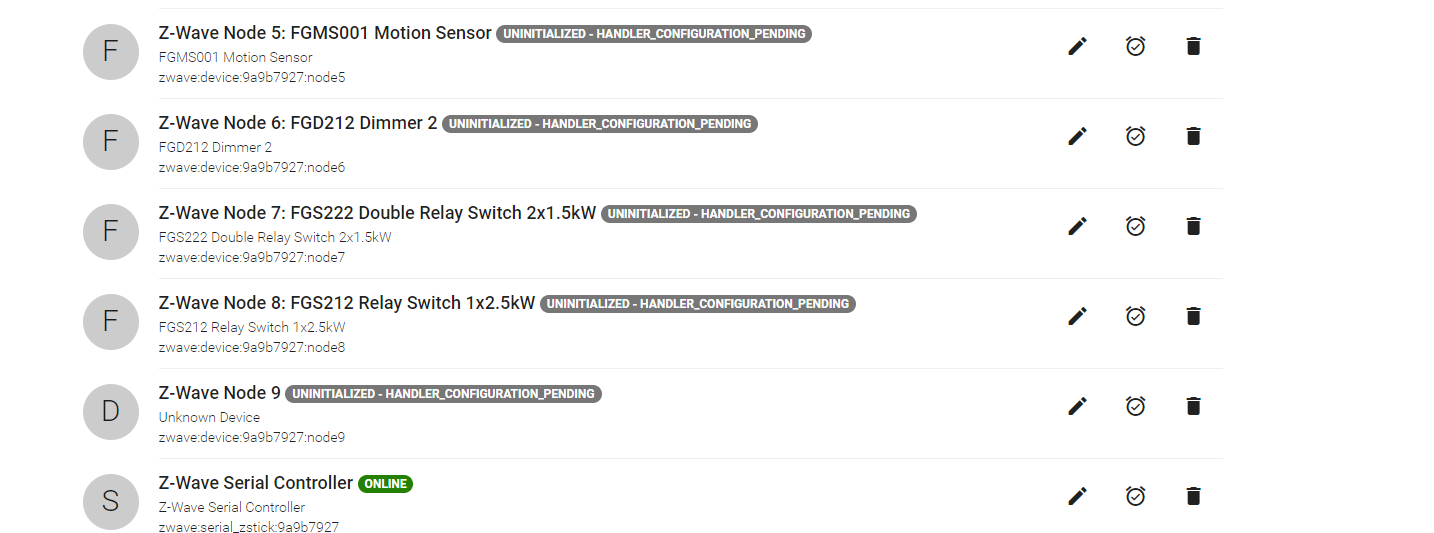 2018-12-23 20:18:57.703 [hingStatusInfoChangedEvent] - 'zwave:device:9a9b7927:node9' changed from UNINITIALIZED (BRIDGE_UNINITIALIZED) to UNINITIALIZED (HANDLER_CONFIGURATION_PENDING)