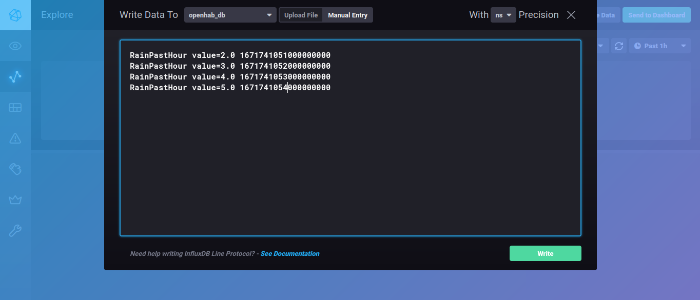 This one is actually pretty neat. In Chronograf, if you click on Explore and then Write data, a window opens that expects the same command as the terminal-box, except that you don’t need insert (e.g. <item name> value=2.0 1638301257000000000). Plus, it allows you insert more strings below each other, which is really handy if you want to include more values at once: