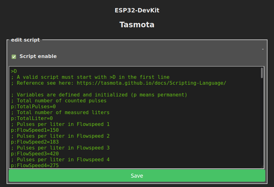 - Since a Tasmota version with “Script” instead of “Rules” is needed, either compile it yourself or download it here (ESP32) or here (ESP8266). I did the latter, which worked fine.