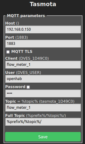 Please also note that the topic of your Tasmota device (in my case flow_meter_1) has to match whatever you have configured in Tasmota under “Configuration” → “MQTT Parameters” → “Topic”.