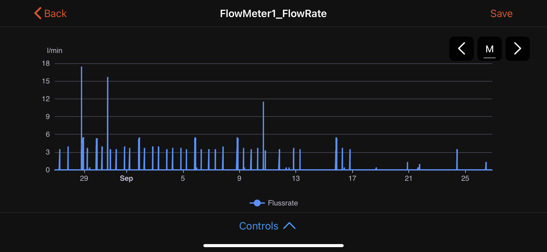The script basically converts “# of ticks in a timeframe” into “water flown through in the same timeframe”. Unfortunately, the “# of ticks per amount of water” is not constant over the “flowspeed”, probably because it is a really cheap sensor. To compensate for that, the script above distinguishes six different flow speeds (precise enough for me), ranging from “2 pulses per second” (water only dripping through) up to “75 pulses per second” (full speed).