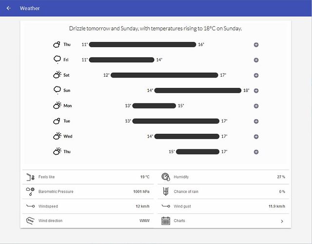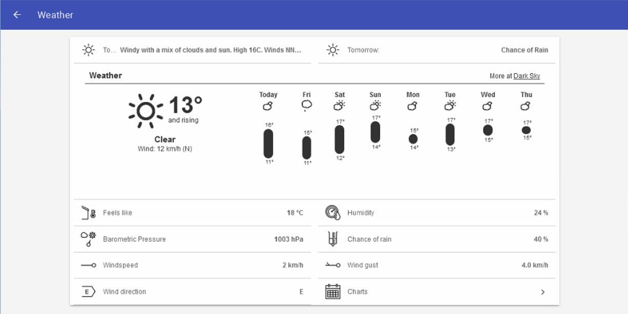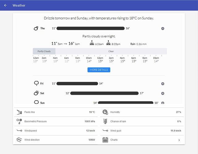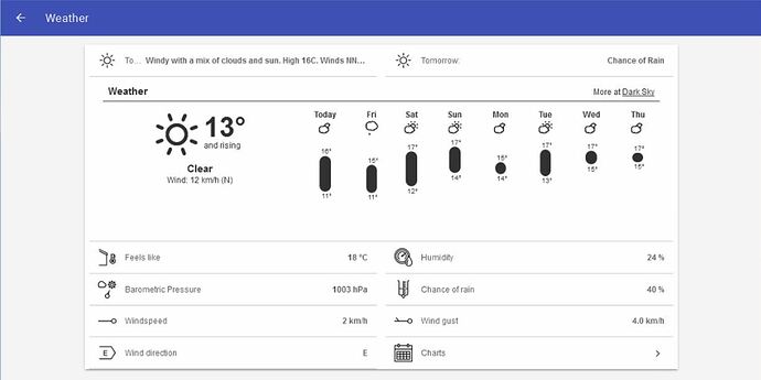I’ve been experimenting with iFrames for the Grafana persisted data and thought i’d have a look at options for a nice weather gui as well. The benefit of an iframe is that there can be a level of interactivity within the frame; dynamically loading/modifying content/icons etc.