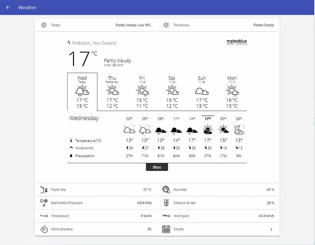 For this example I will show the one I like the best (MeteoBlue) although it’s weather forecast doesn’t align exactly with my local forecasters so my mileage may vary.