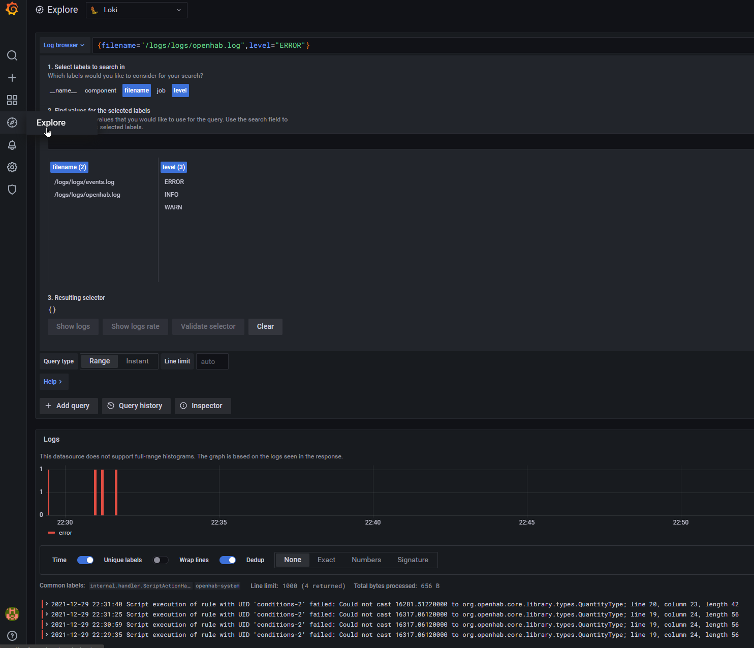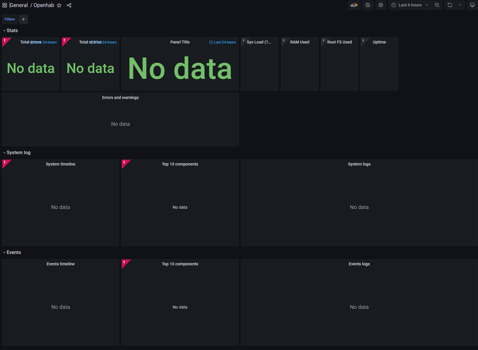 This small tutorial explains some of the basics of setting up a log and system monitoring environment. I use this in case of issues with my openhab setup, to analyse what went wrong, when to find a solution. It’s difficult to do this from the text files and sometimes openhab stops being happy due to platform issues (low on RAM). So that’s why I integrated both log and platform monitoring in a grafana dashboard. It’s not easy to figure out all the steps, so I wanted to share my experience and hope other can benefit from it.