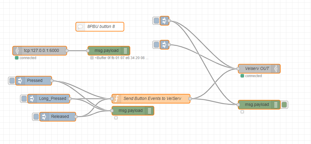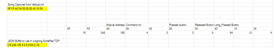 "func": "var button = 64; // Decimal of Hex 40, which is button No 7 only (Different numbers are generated if multiple buttons are pressed). Note Dec 64 is derived from the Binary state 01000000 indicating button 7\nvar address = 160; // Decimal of Hex A0\n\nvar incoming = String(msg.payload);\nvar buffer = \"\"\n\nif (incoming == \"Pressed\" ) {\n// Format Pressed event\nbuffer = Buffer.from( [0x0F, 0xF8, address, 0x04, 0x00, button, 0x00, 0x00, 0x15, 0x04] );\nreturn {payload:buffer};\n\t}\n\nif (incoming == \"Released\" ) {\n// Format Released event\nbuffer = Buffer.from( [0x0F, 0xF8, address, 0x04, 0x00, 0x00, button, 0x00, 0x15, 0x04] );\nreturn {payload:buffer};\n\t}\n\t\nif (incoming == \"Long_Pressed\" ) {\n// Format Long_Pressed event\nbuffer = Buffer.from( [0x0F, 0xF8, address, 0x04, 0x00, 0x00, 0x00, button, 0x15, 0x04] );\nreturn {payload:buffer};\n\t}\t\n\t\n\treturn [msg];\n\n\n// Press of Button 7 0F F8 A0 04 00 40 00 00 15 04\n// Long press of Button 7 0F F8 A0 04 00 00 00 40 15 04\n// Release of Button 7 0F F8 A0 04 00 00 40 00 15 04",