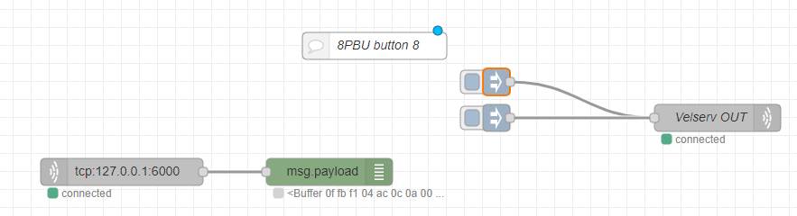 The flow I used in NodeRed is this, which you can simply import into your own NodeRed instance, assuming that you have VelServ running on the same machine, on port 6000