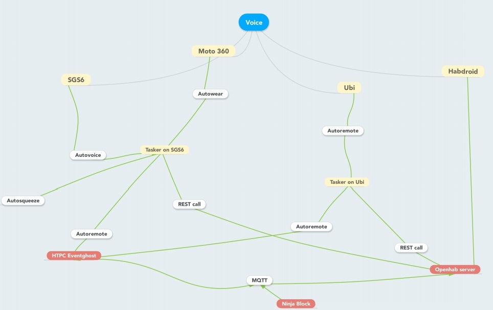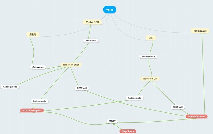 I have been considering my voice command structure for a while, as I use voice with my android devices (phone and Moto 360), an Ubi voice controlled computer, and now with Openhab. I have been considering a way to centralise my voice actions, and suspect this will be best performed using Google + Autovoice, tasker and then distribution over MQTT, REST calls and using AutoRemote.