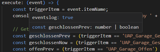 openHAB JavaScript library provides type definitions for most of its APIs to enable code completion is IDEs like VS Code (opens new window). To use the type definitions, install the