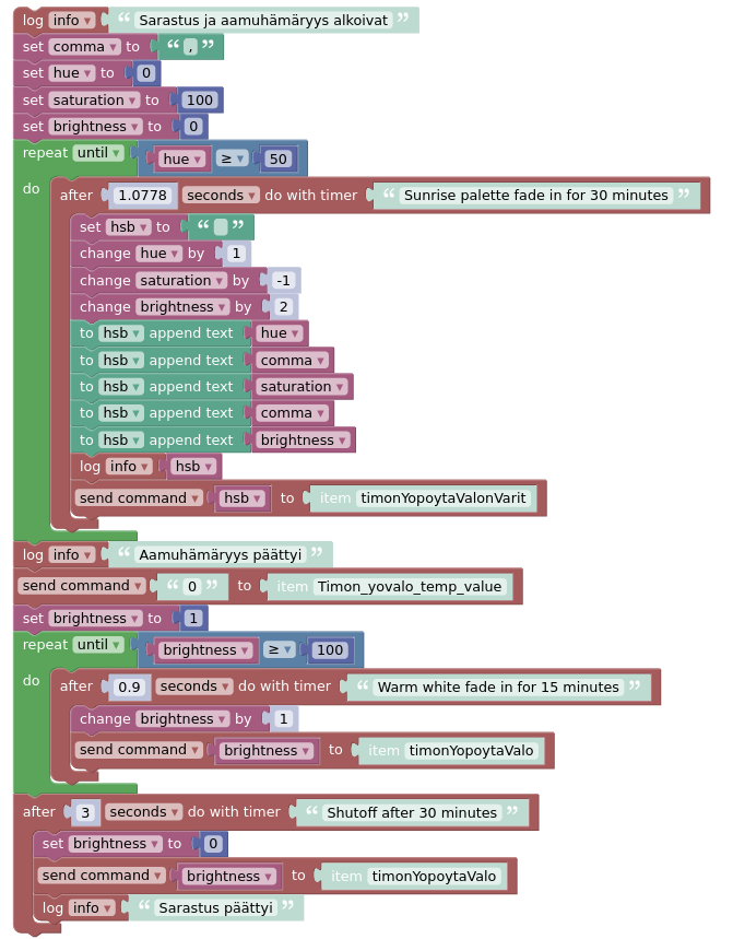 Shortly, the script is supposed to during the first 30 minutes make my bedside lamp run through a sunrise palette of colours and then in 15 minutes run up the warm white light from 1% to 100%. The lamp will stay on for half an hour and then shut it self off. I trigger it with cron from the UI. It has now run once. I will now go the bed and see and report what happens tomorrow morning.