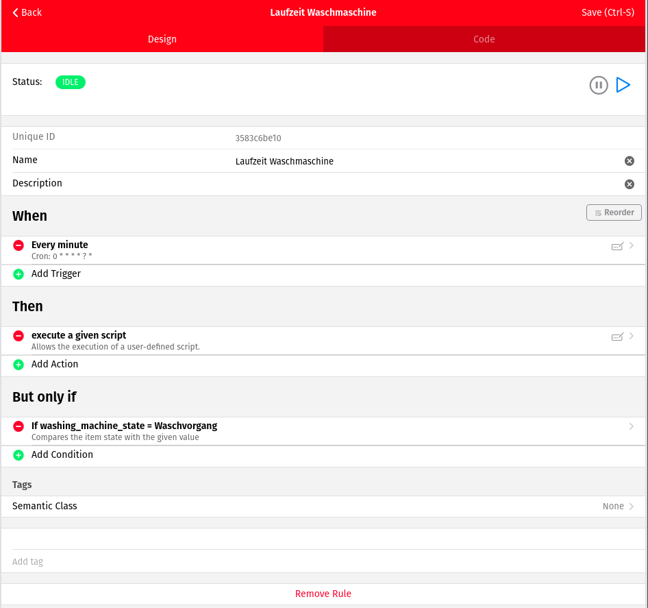 - Minutes running: Sets the time inside of the machine. This should be evaluated by an expression (e.g. =items.washing_machine_runtime.state).