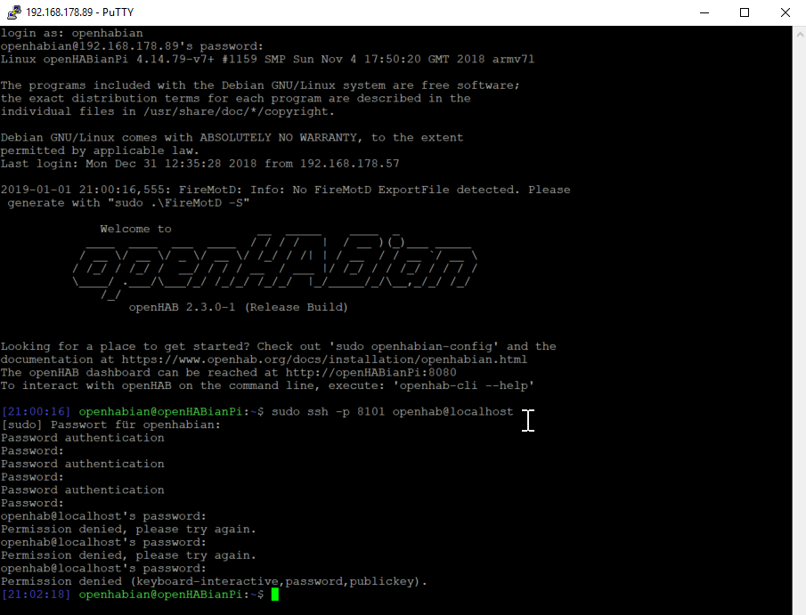 User password needed for SSH or sudo (e.g. “openhabian:openhabian”)