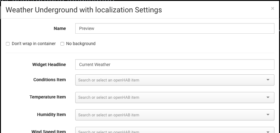 Iād really like to get this widget working but am struggling. Iāve got the latest version of OH2 on an Openhabian RPi 3 B+. I installed the WU binding via PaperUI and itās working fine. I have a Local Weather thing.