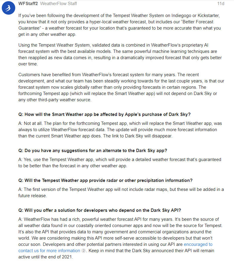 Anyway, this is yet another good reason to invest in Weatherflow solutions Tempest Response to Appleās Purchase of Dark Sky - The Tempest Weather Community.