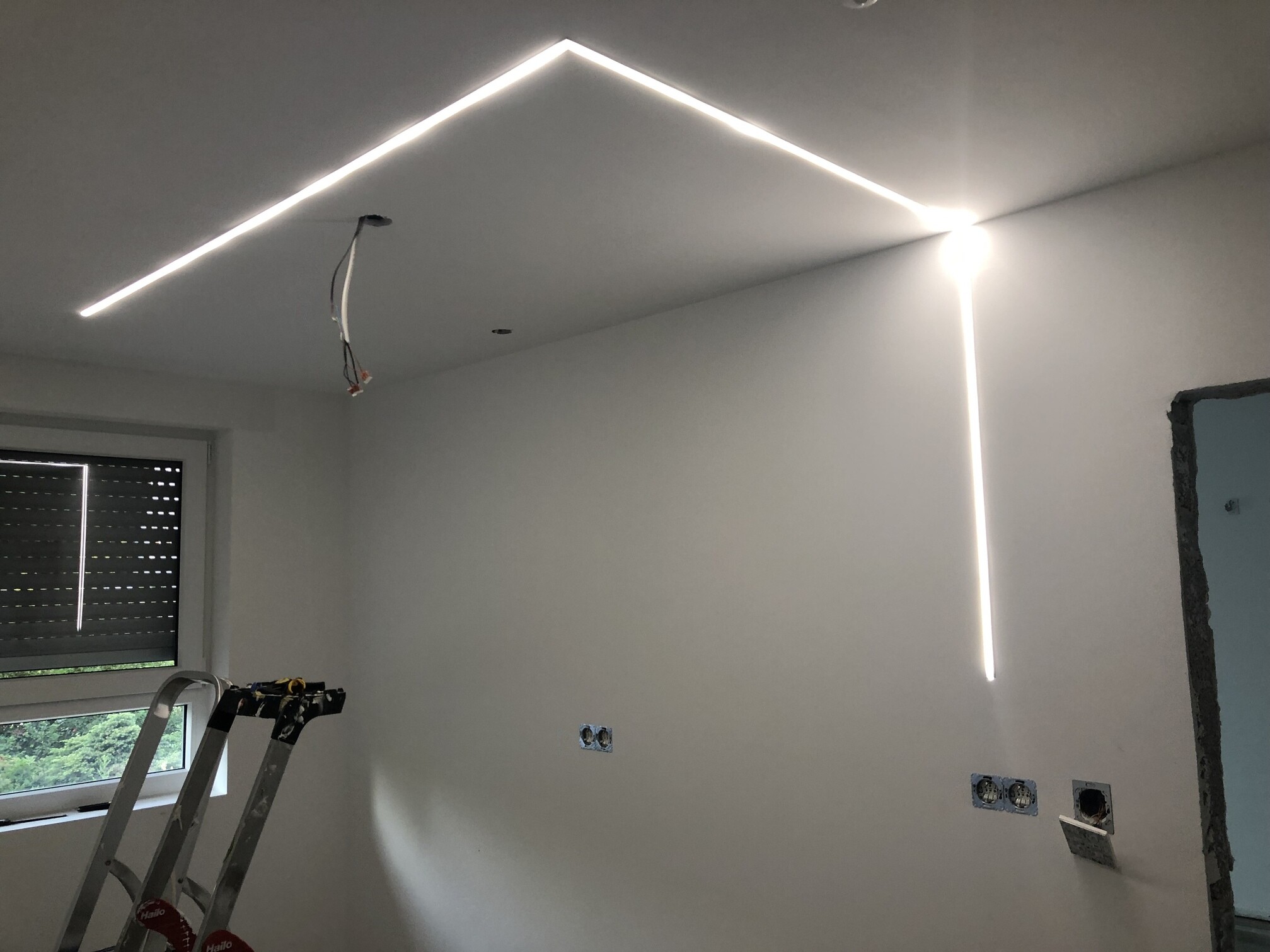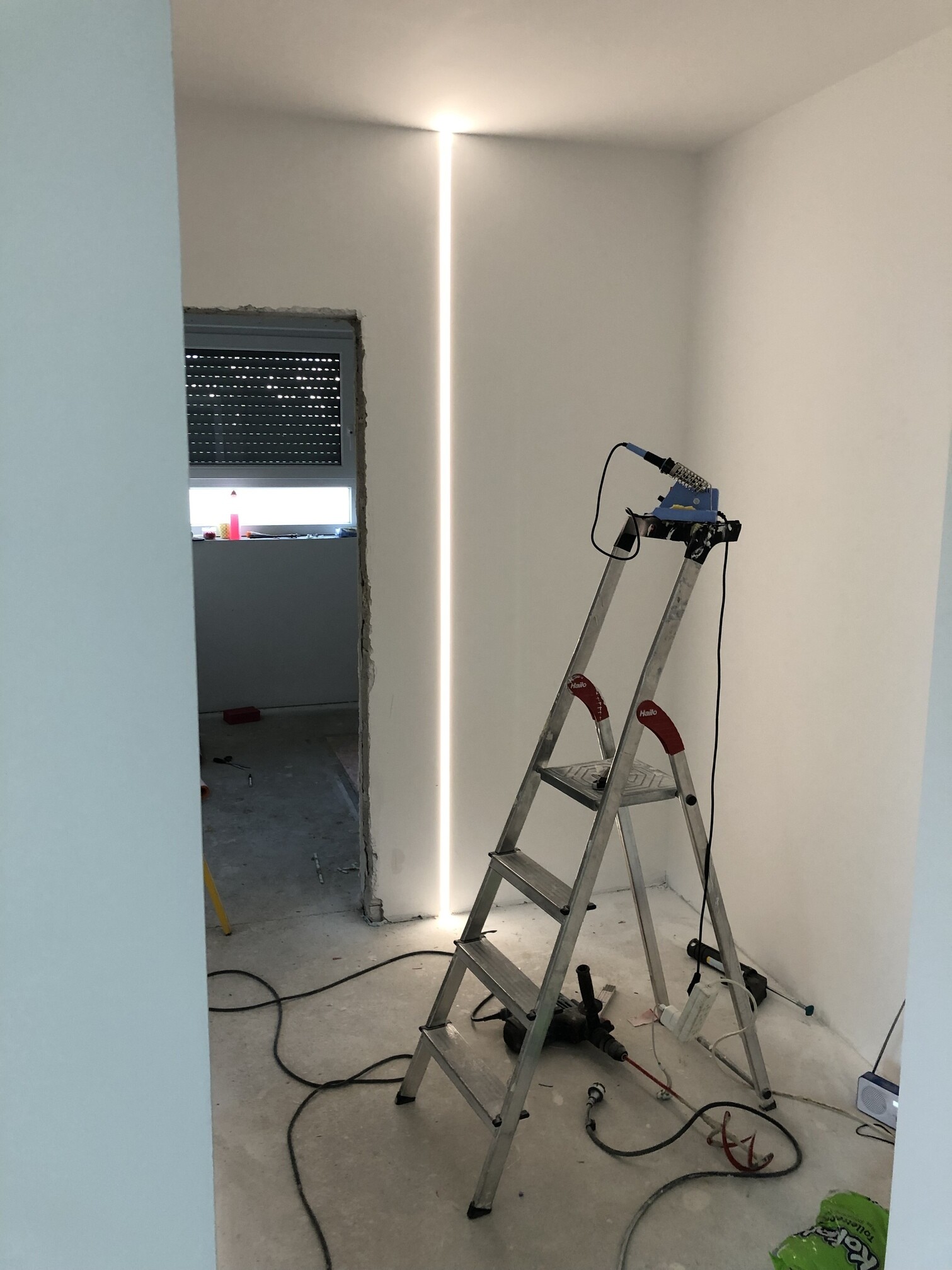 A LED Aluminum Profile included in the ceiling and wall. With an Tunablewhite stripe, controlled by DMX Binding and KNX (self designed) switch (ZENNIO TMD Plus).