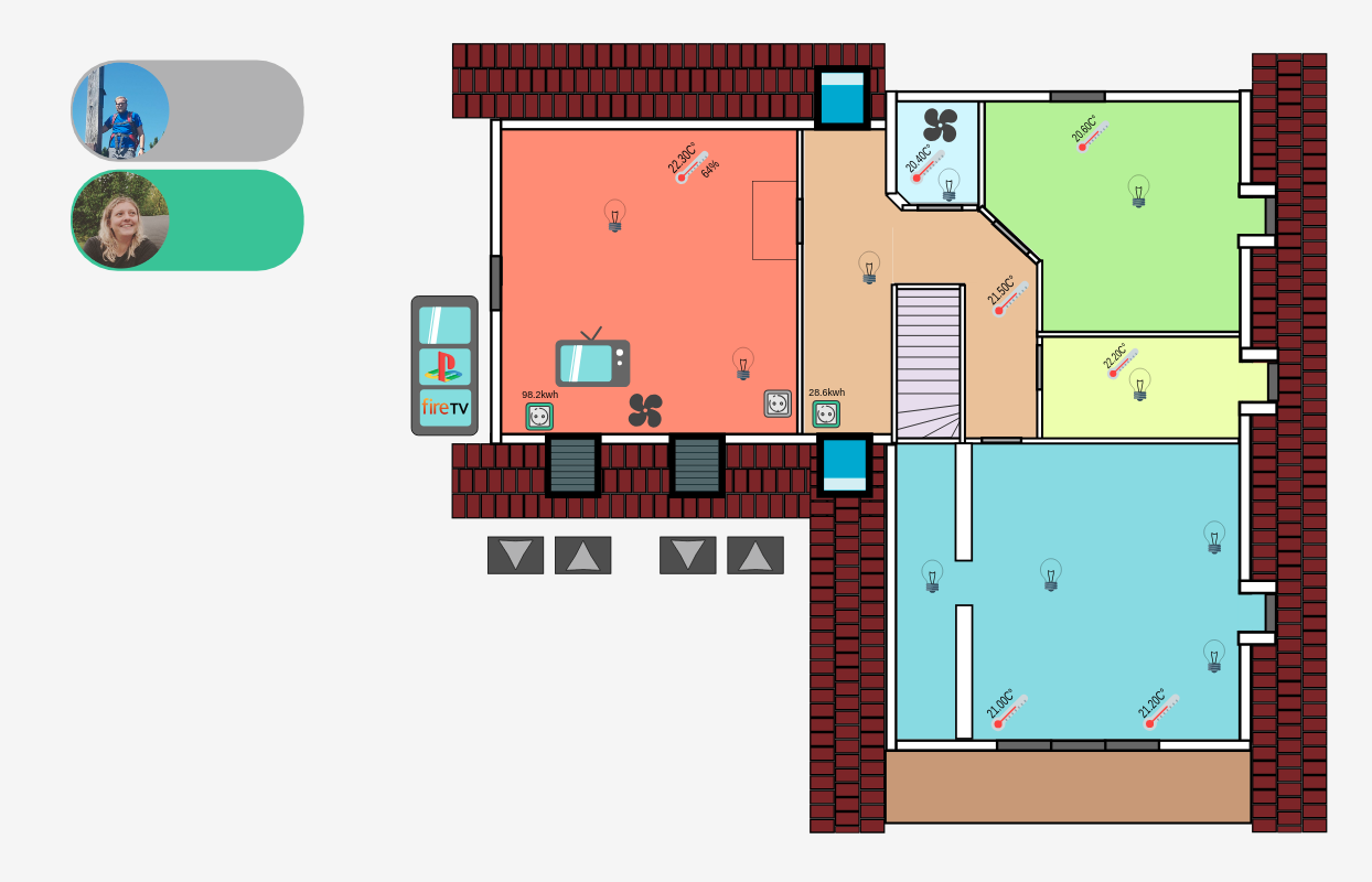 All Lights are clickable. The doors, fans, the garage door and the shutters are animated.