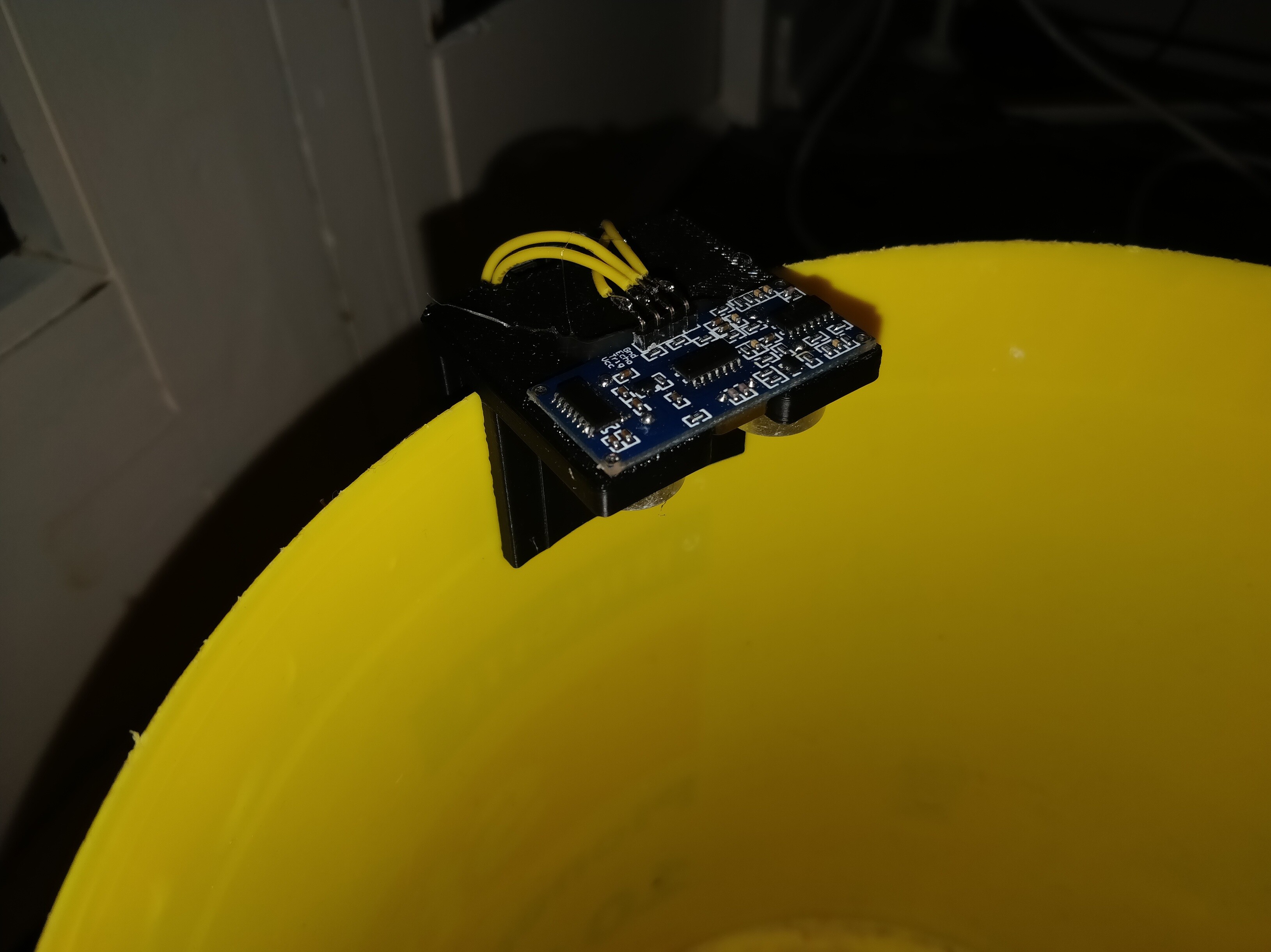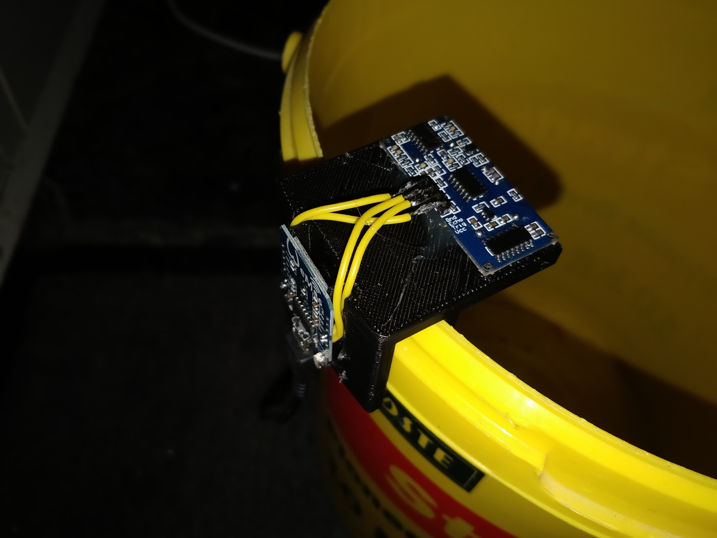 The device is pretty simple, it is only a Wemos D1 mini and an HC-SR04 based ultrasonic distance sensor, which is mouned on a 3D printed bracket with hot glue. The device can then easy be removed from the bucket when it needs to be emptied.