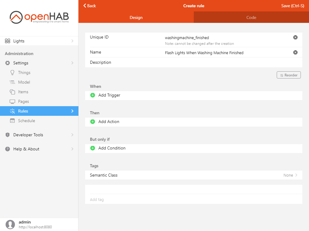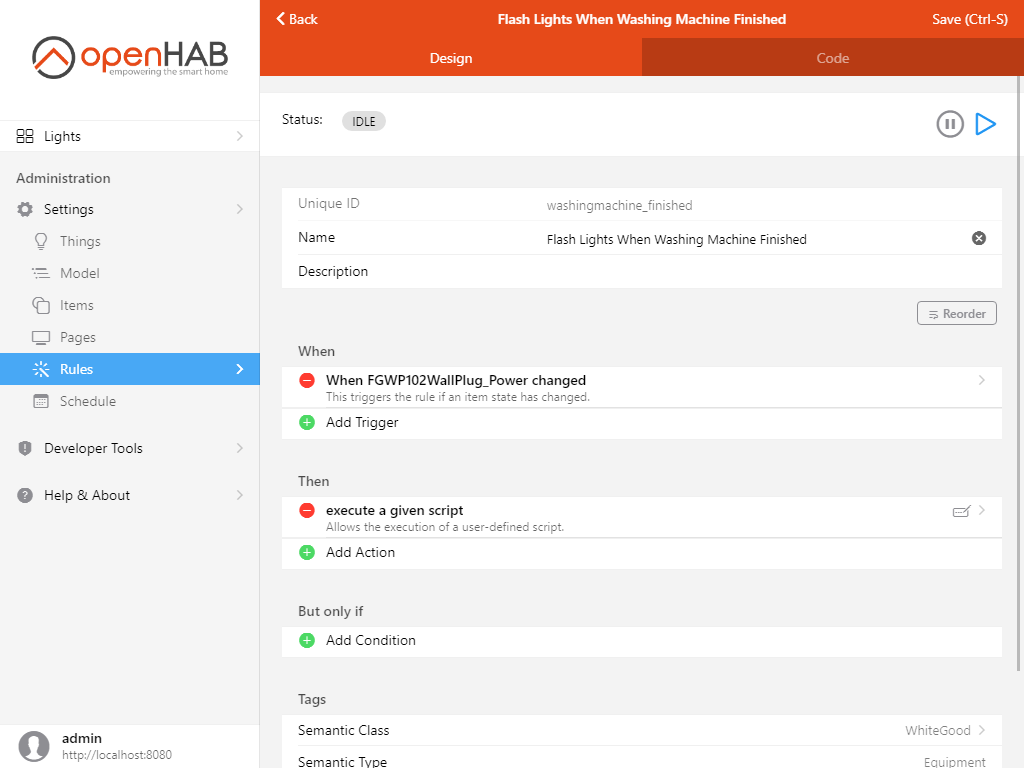 Close the code editor, and save the rule. You should now see the lights flashing when the power drawn from the washing machine drops below 2 W from above that threshold!