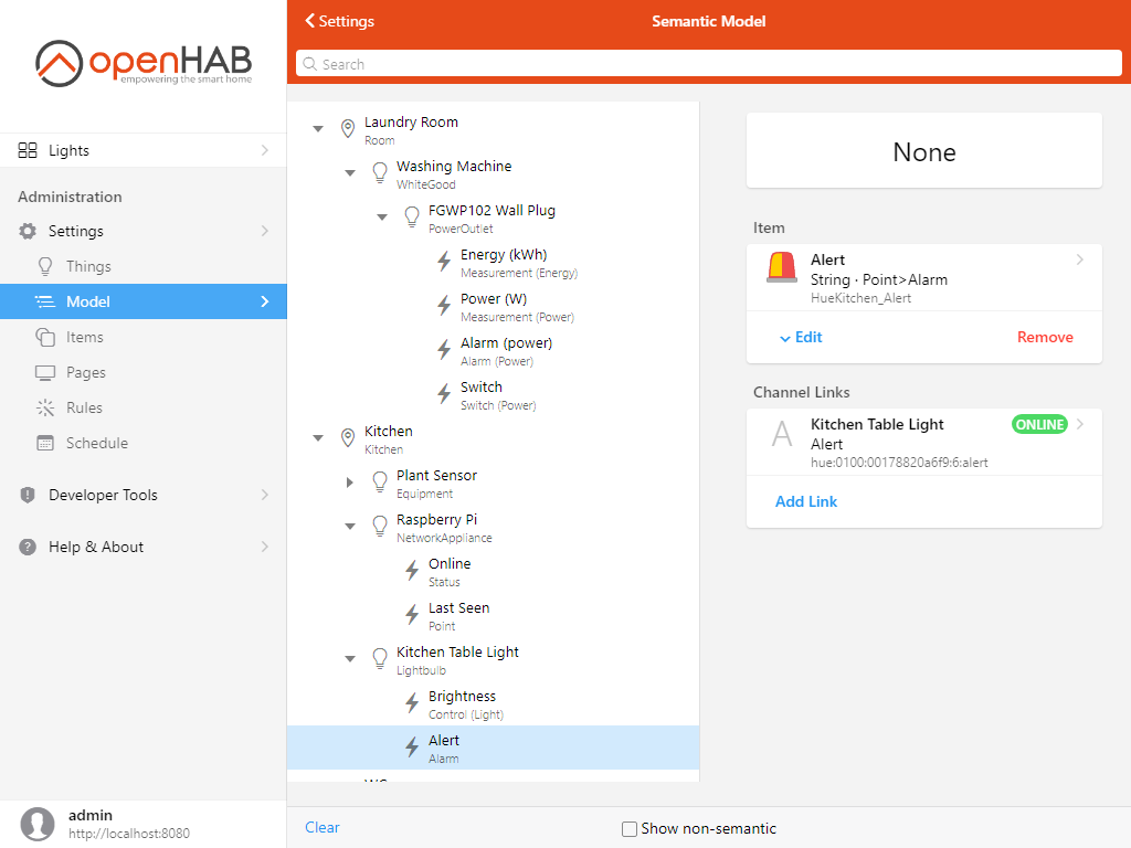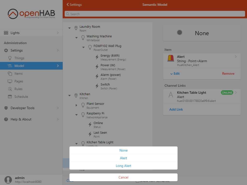 According to the documentation of the hue binding, the light bulb defines an “alert” channel, which will make the light bulb flash when we send certain commands (SELECT, LSELECT or NONE). we have therefore added a Point item and linked it to that channel. Pushing the default widget for it opens a list of command options provided by the binding; we can try selecting “Long Alert”: the light will flash for a couple of seconds - that’s what we want.