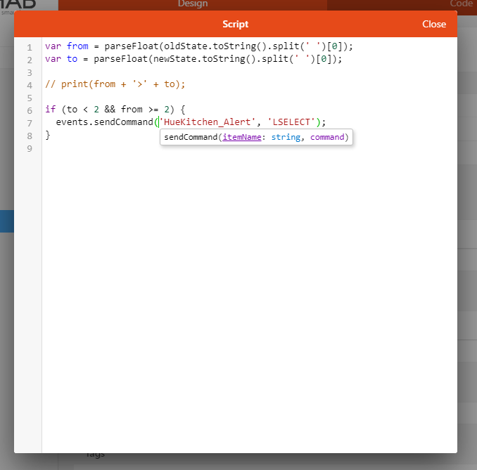 events.sendCommandmethod made available to the script to send the LSELECT command to theHueKitchen_Alertitem - but only when the previous parsed state was >=2 and the current one is < 2.