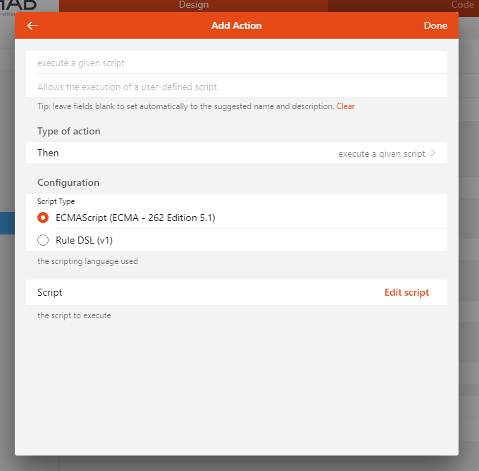 We’ll do it in a script action.Click Add Action and choose “execute a given script”.