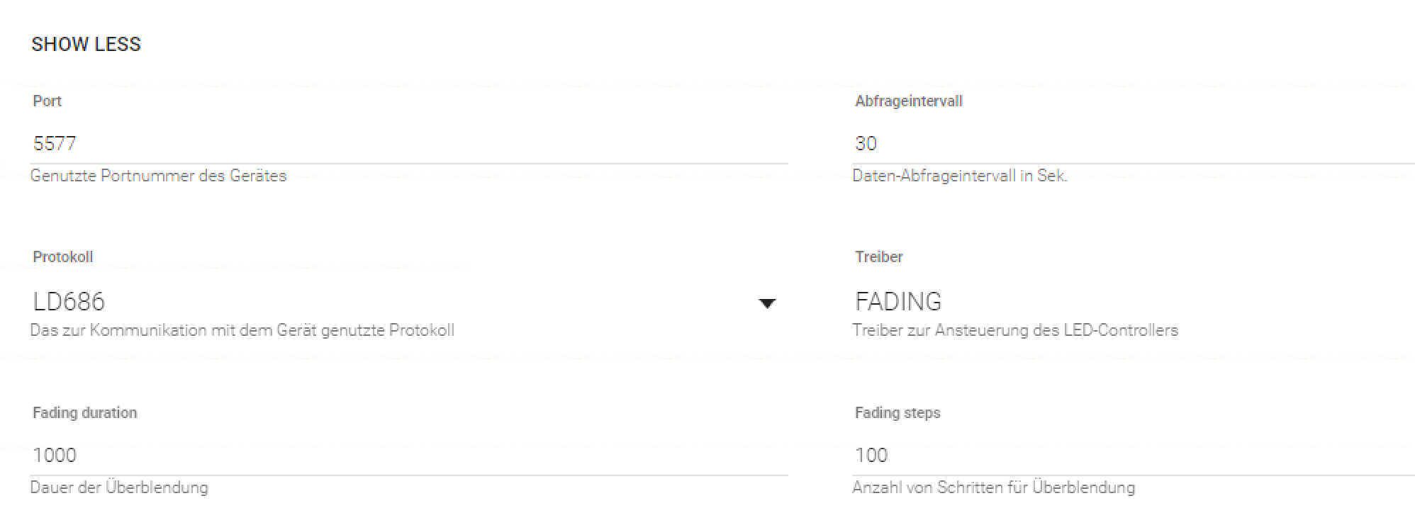 With the FADING program I use the default values for program speed. It works to me - the light is fading. I’ve not tried to change the values, so I cannot tell if they are accessible from a functional perspective. In the GUI it seems to be changeable.