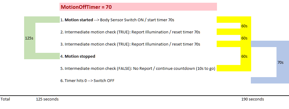 According to my tests the MotionOffTimer should be set to a value higher than 60s (whenever a motion check is performed). Every 60s a check is performed and if motion is dectected, the motionofftimer will be reset and starts from new. At the same time (if motion is detected) illumination is reported. See attached chart.