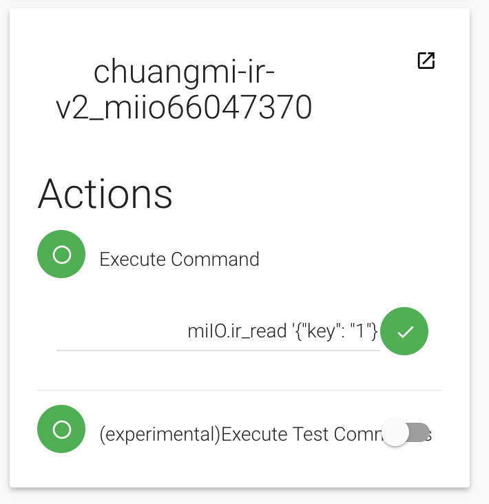 You can than use the cmd channel to execute commands. From what I saw there are 2 commands: miIO.ir_learn["key" : 1] → to learn codes. replace the number with the id you want to learn miIO.ir_read["key" : 1 ] → to read the key. dunno what that actually means miIO.ir_play["freq": 38400, "code": command ] → I guess the commands can be obtained with the read cmd. the frequency is the default one.. you probably can have different ones as well.